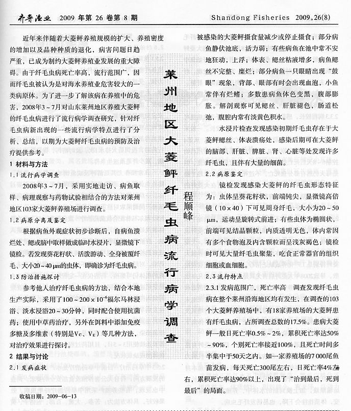 萊州地區(qū)大菱鲆纖毛蟲病流行病學(xué)調(diào)查1