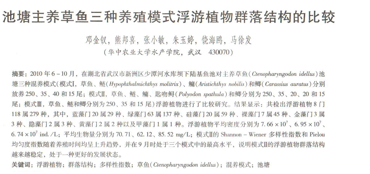 池塘主養(yǎng)草魚(yú)三種養(yǎng)殖模式浮游植物群落結(jié)構(gòu)的比較