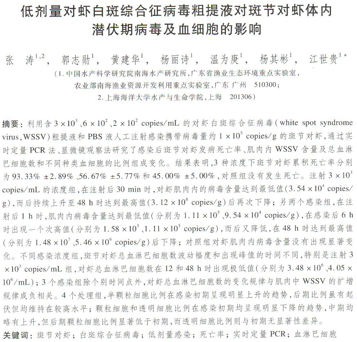 低劑量對(duì)蝦白斑綜合征病毒粗提液對(duì)斑節(jié)對(duì)蝦體內(nèi)潛伏期病毒及血細(xì)胞的影響