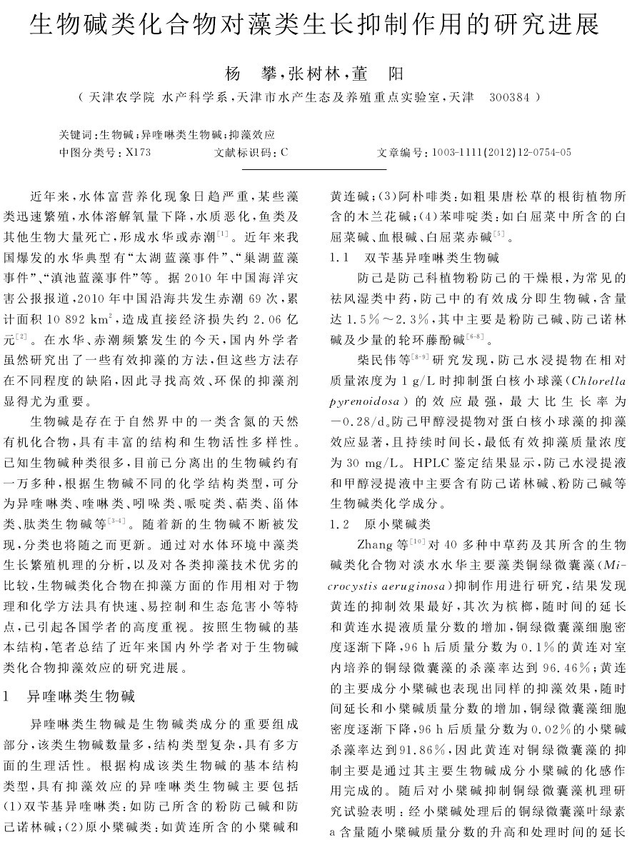 生物堿類(lèi)化合物對(duì)藻類(lèi)生長(zhǎng)抑制作用的研究進(jìn)展