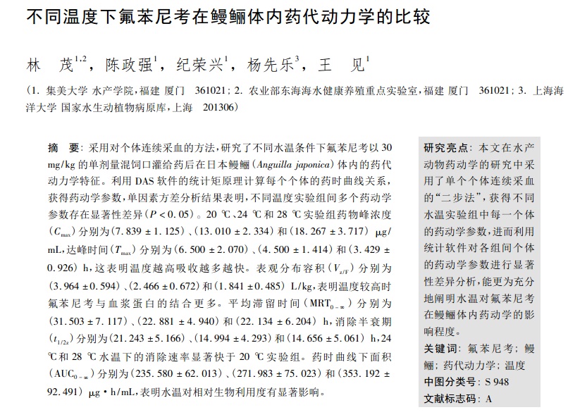 不同溫度下氟苯尼考在鰻鱺體內(nèi)藥代動力學(xué)的比較