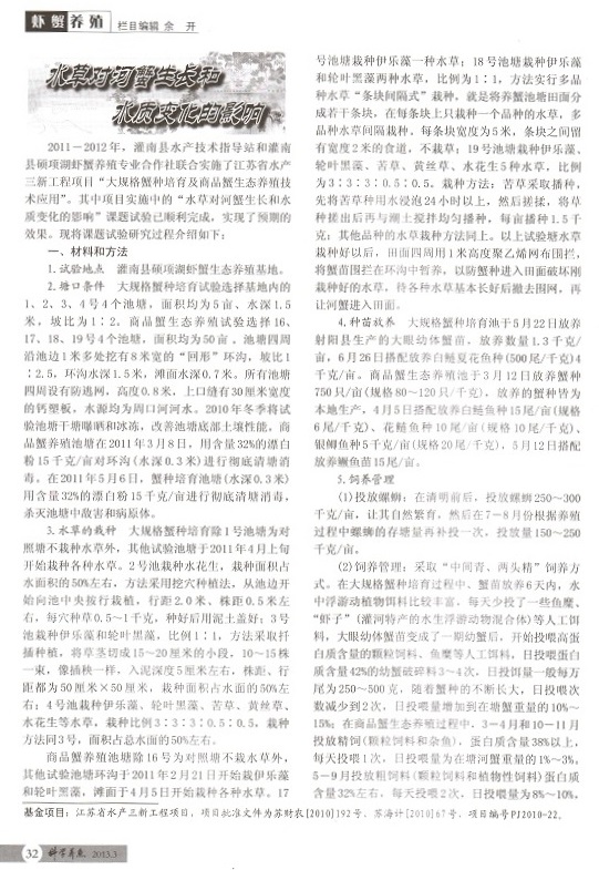 水草對(duì)河蟹生長(zhǎng)和水質(zhì)變化的影響