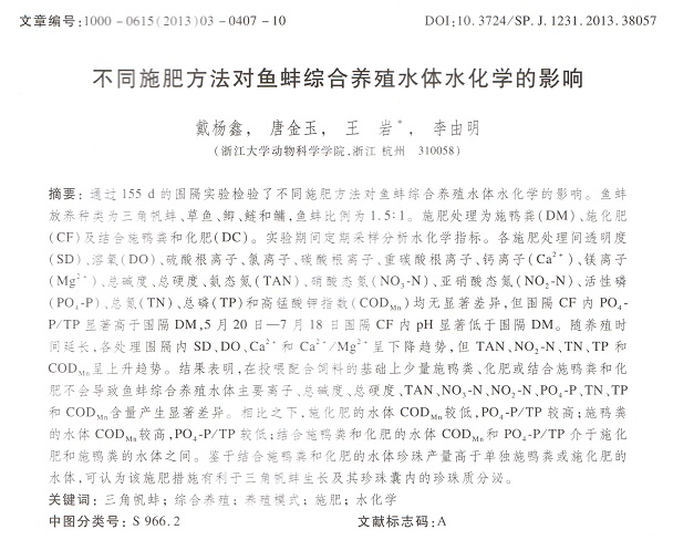 不同施肥方法對魚蚌綜合養(yǎng)殖水體水化學的影響