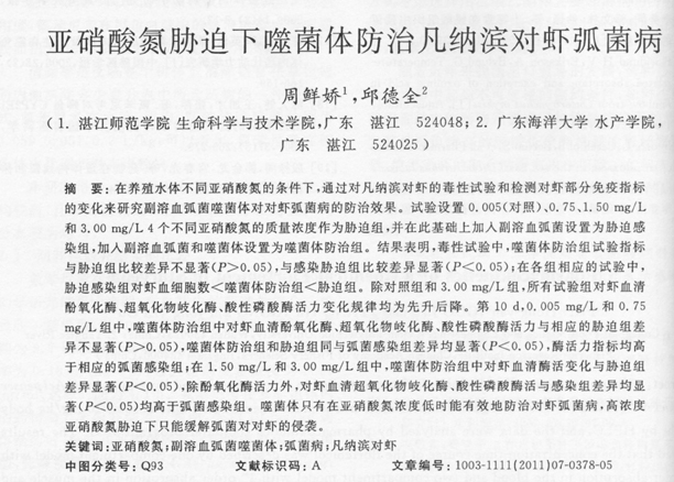 亞硝酸氮脅迫下噬菌體防治凡納濱對蝦弧菌病