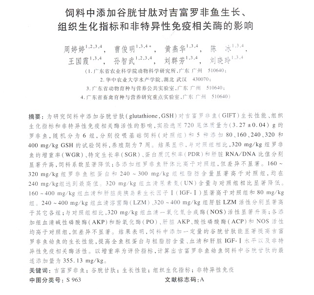 飼料中添加谷胱甘肽對吉富羅非魚生長、組織生化指標和非特異性免疫相關酶的影響