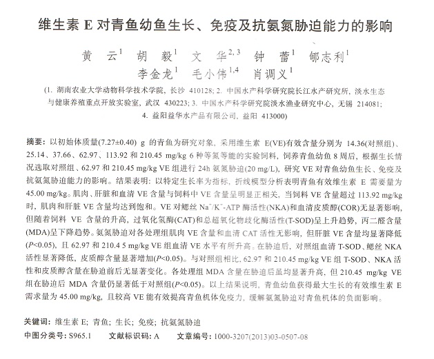 維生素E對(duì)青魚幼魚生長、免疫及抗氨氮脅迫能力的影響
