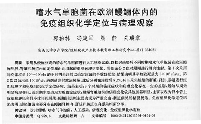 嗜水氣單胞菌在歐洲鰻鱺體內的免疫組織化學定位與病理觀察