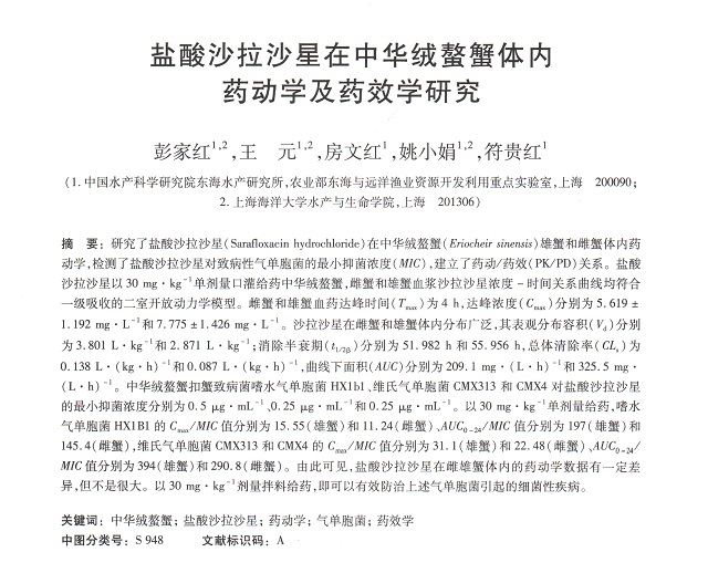 鹽酸沙拉沙星在中華絨鰲蟹體內(nèi)藥動學(xué)及藥效學(xué)研究