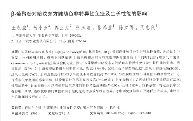 β-葡聚糖對暗紋東方鲀幼魚非特異性免疫及生長性能的影響