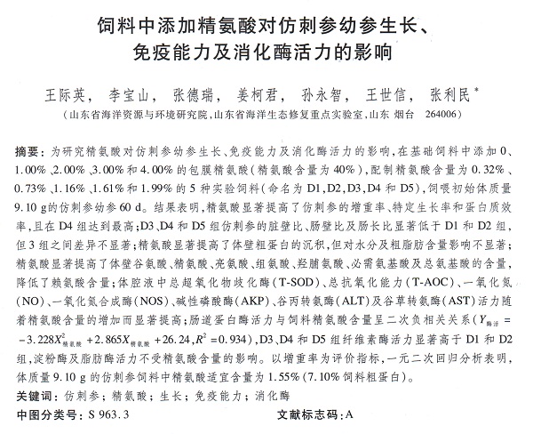 飼料中添加精氨酸對(duì)仿刺參幼參生長(zhǎng)、免疫能力及消化酶活力的影響