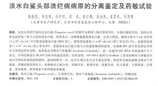 淡水白鯊頭部潰爛病病原的分離鑒定及藥敏試驗(yàn)
