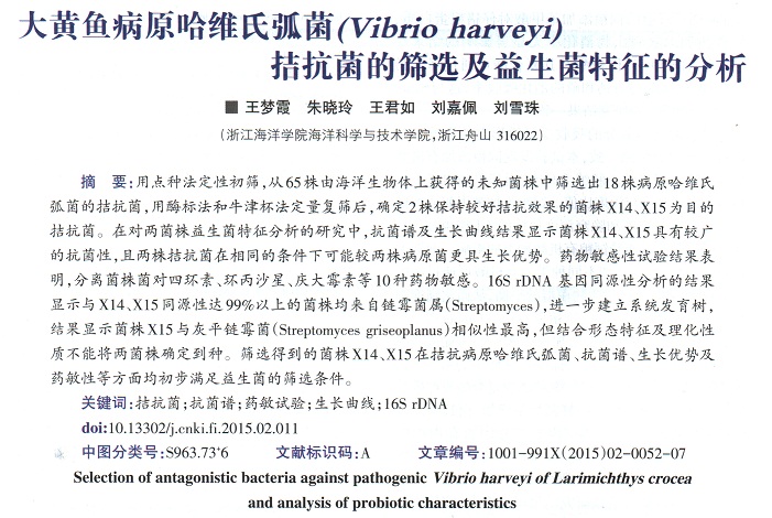大黃魚病原哈維氏弧菌(Vibrio harveyi)拮抗菌的篩選及益生菌特性的分析