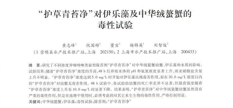 “護草青苔凈”對伊樂藻及中華絨螯蟹的毒性試驗