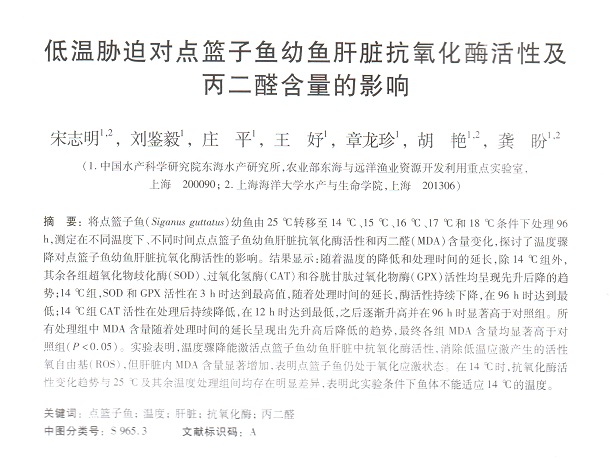 低溫脅迫對點籃子魚幼魚肝臟抗氧化酶活性及丙二醛含量的影響