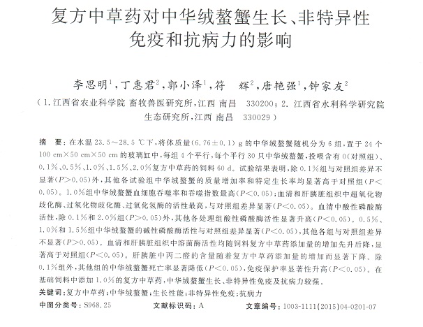 復(fù)方中草藥對中華絨螯蟹生長、非特異性免疫和抗病力的影響