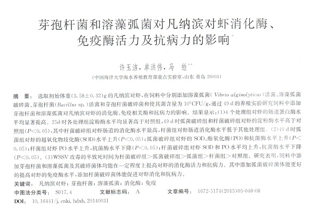 芽孢桿菌和溶藻孤菌對凡納濱對蝦消化酶、免疫酶活力及抗病力的影響