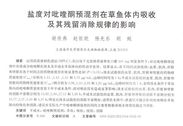 鹽度對(duì)吡喹酮預(yù)混劑在草魚(yú)體內(nèi)吸收及其殘留消除規(guī)律的影響