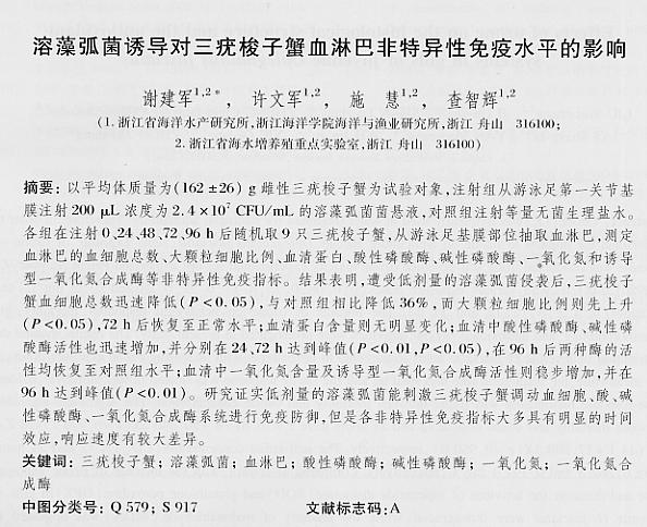 溶藻弧菌誘導(dǎo)對三疣梭子蟹血淋巴非特異性免疫水平的影響