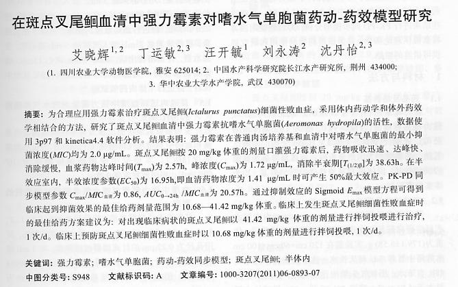 在斑點叉尾鲴血清中強(qiáng)力霉素對嗜水氣單胞菌藥動一藥效模型研究