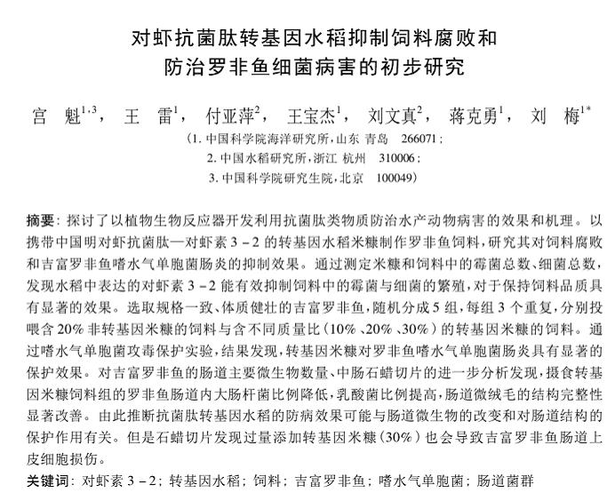 對(duì)蝦抗菌肽轉(zhuǎn)基因水稻抑制飼料腐敗和防治羅非魚細(xì)菌病害的初步研究
