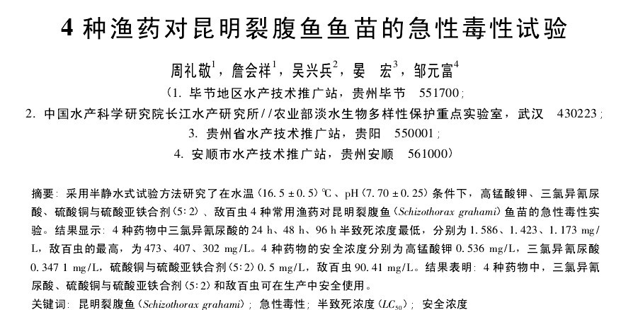 4種漁藥對(duì)昆明裂腹魚魚苗的急性毒性試驗(yàn)