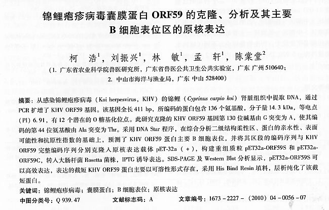 錦鯉皰疹病毒膜蛋白ORF59的克隆、分析及其主要B細(xì)胞表位區(qū)的原核表達(dá)