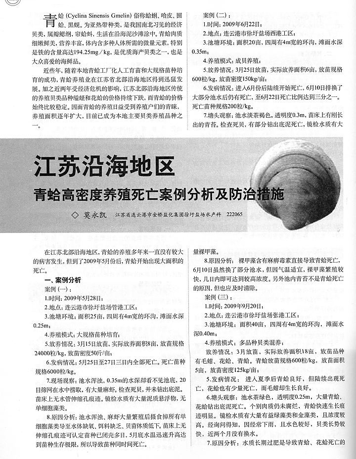 江蘇沿海地區(qū)青蛤高密度養(yǎng)殖死亡案例分析及防治措施1
