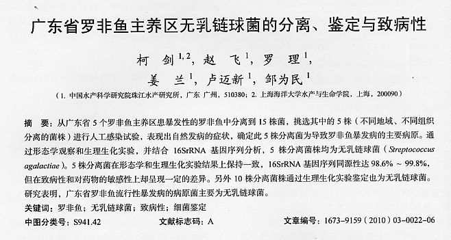 廣東省羅非魚主養(yǎng)區(qū)無乳鏈球菌的分離、鑒定與致病性