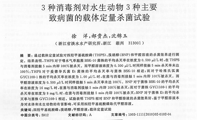 3種消毒劑對水生動物3種主要致病菌的載體定量殺菌實驗