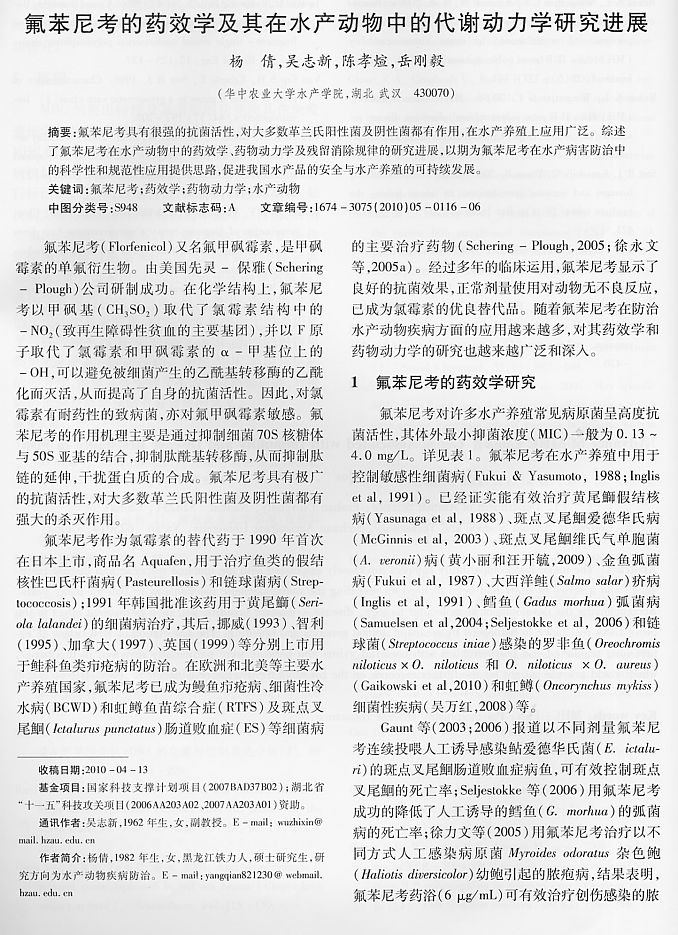 氟苯尼考的藥效學(xué)及其在水產(chǎn)動(dòng)物中的代謝動(dòng)力學(xué)研究進(jìn)展1