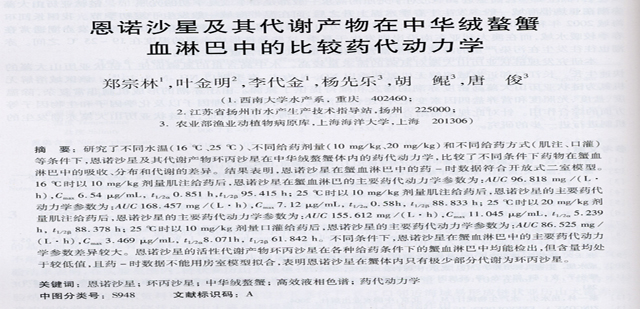 恩諾沙星及其代謝產(chǎn)物在中華絨螯蟹血淋巴中的比較藥代動力學