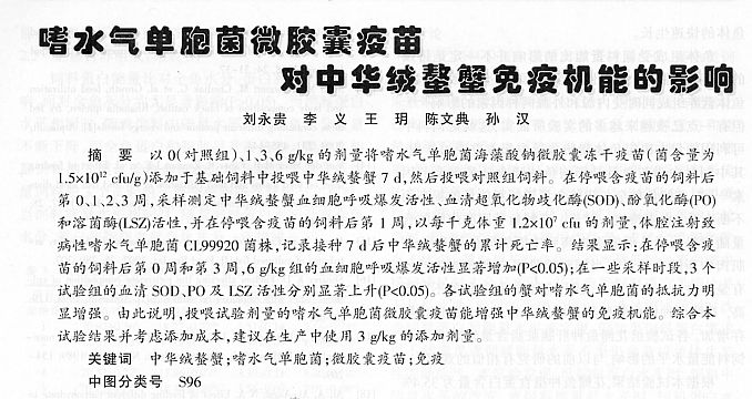 嗜水氣單胞菌微膠囊疫苗對中華絨螯蟹免疫機(jī)能的影響